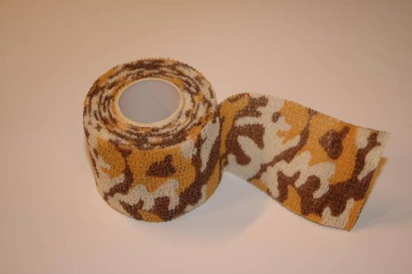 BRUNST KAMUFLASJETAPE FOR BRUK PÅ STUBBÅKER, I KORN ELLER I SIVET. SELVHEFTENDE! Kan tas av og på gjentatte ganger uten å etterlate festemiddel. Beskytter utstyret. Ypperlig til våpen, lyddempere, termos etc. Isolerer kalde overflater og elliminerer reflekser. 5 cm. bredde – 4,5 meter strukket lengde.